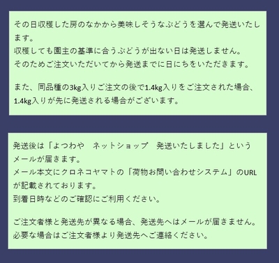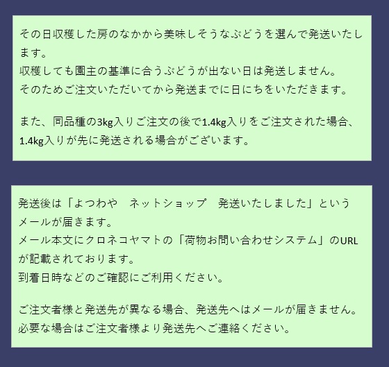 ぶどうは衝撃に弱い果物です。とれたてのぶどうを注意して梱包しておりますが熟したぶどうはどうしても粒が軸からはずれやすくなっております。数粒の外れはご容赦ください。